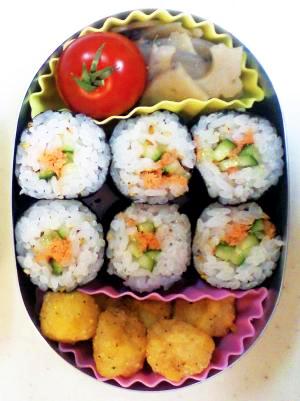 @bluemug137様 海苔巻き弁当作りました 鶏ササミフライ海苔巻き ゆかりチーズ海苔巻き 竹輪きゅうり🥒 枝豆カニカマハンペン卵焼き (これ、なんか作るのが楽しい!